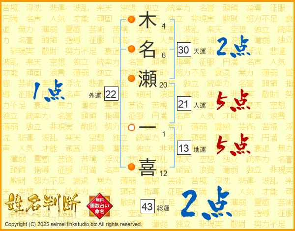 木(4画)名(6画)瀬(20画) 一(1画)喜(12画)