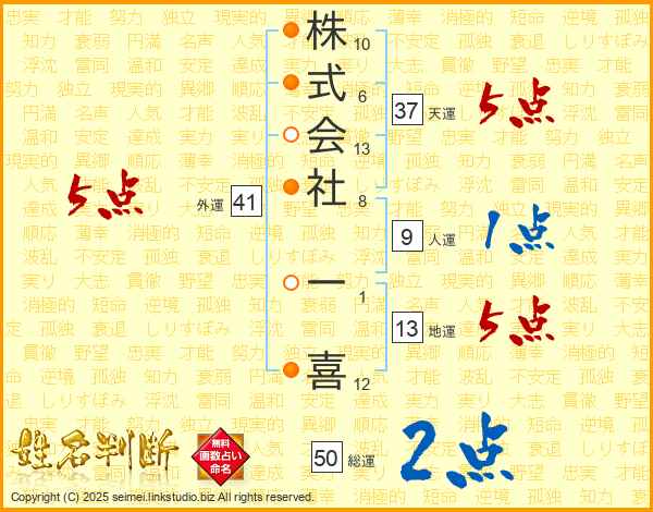 株(10画)式(6画)会(13画)社(8画) 一(1画)喜(12画)