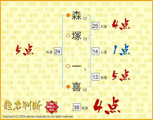 生活面を象徴する運勢です。外部から受ける影響力を表し、結婚運、家庭運や職場、環境への順応性を表します。総運から人運を引いた画数。姓や名が1文字の場合を除く。