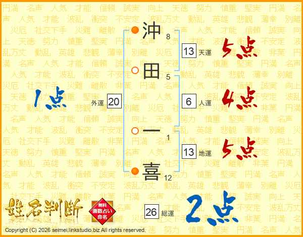 沖田一喜さんの総運は26画の2点!