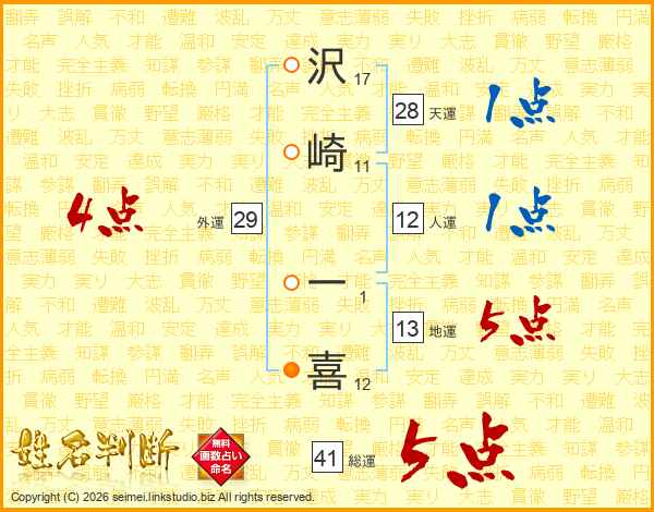 沢(17画)崎(11画) 一(1画)喜(12画)
