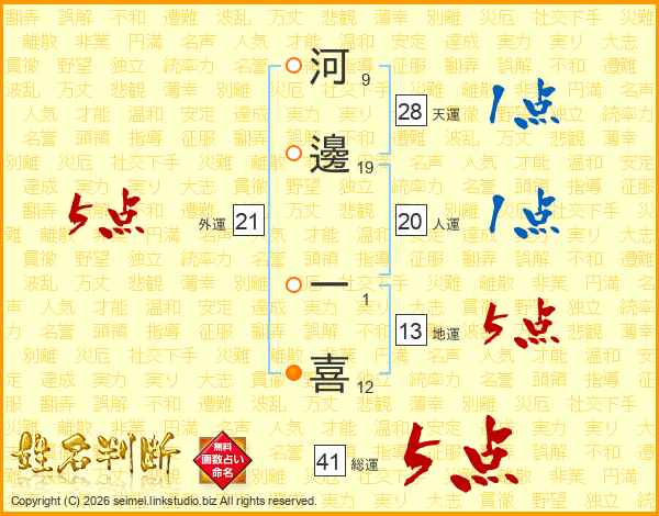 生活面を象徴する運勢です。外部から受ける影響力を表し、結婚運、家庭運や職場、環境への順応性を表します。総運から人運を引いた画数。姓や名が1文字の場合を除く。