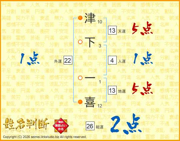 生活面を象徴する運勢です。外部から受ける影響力を表し、結婚運、家庭運や職場、環境への順応性を表します。総運から人運を引いた画数。姓や名が1文字の場合を除く。