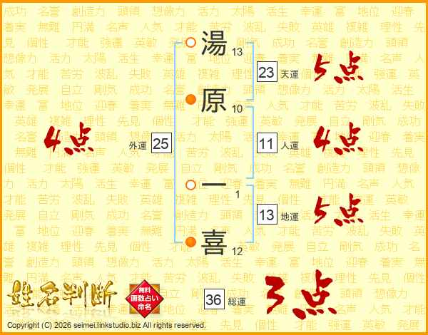 生活面を象徴する運勢です。外部から受ける影響力を表し、結婚運、家庭運や職場、環境への順応性を表します。総運から人運を引いた画数。姓や名が1文字の場合を除く。