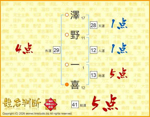 生活面を象徴する運勢です。外部から受ける影響力を表し、結婚運、家庭運や職場、環境への順応性を表します。総運から人運を引いた画数。姓や名が1文字の場合を除く。