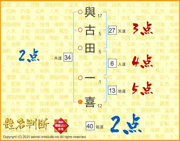與(17画)古(5画)田(5画) 一(1画)喜(12画)