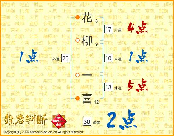 生活面を象徴する運勢です。外部から受ける影響力を表し、結婚運、家庭運や職場、環境への順応性を表します。総運から人運を引いた画数。姓や名が1文字の場合を除く。