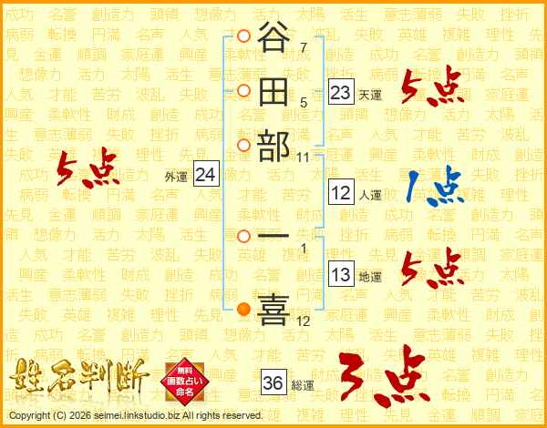 谷(7画)田(5画)部(11画) 一(1画)喜(12画)