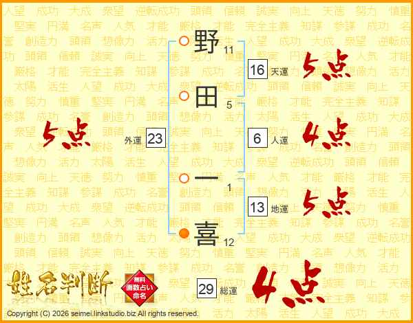 野田一喜さんの総運は29画の4点!