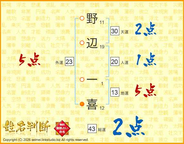 生活面を象徴する運勢です。外部から受ける影響力を表し、結婚運、家庭運や職場、環境への順応性を表します。総運から人運を引いた画数。姓や名が1文字の場合を除く。