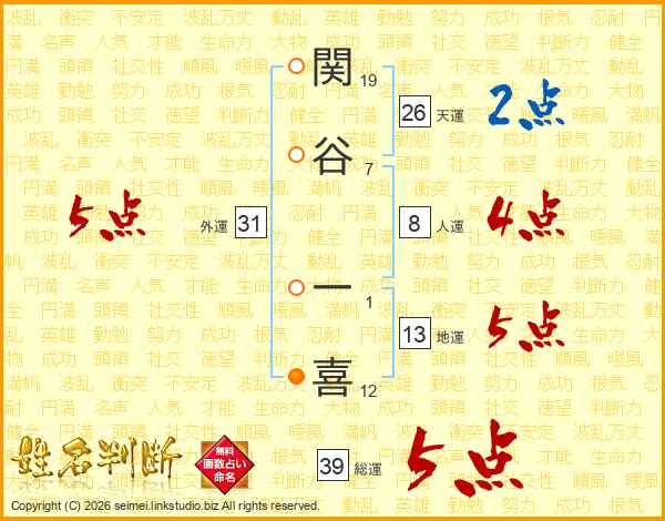 関谷一喜さんの総運は39画の5点!
