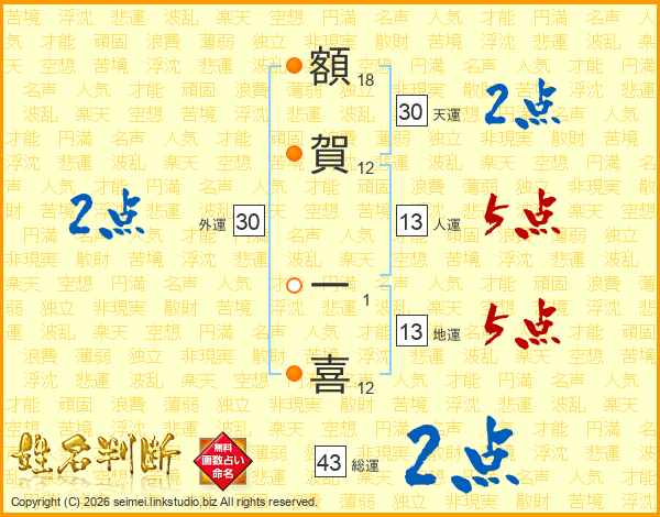 額(18画)賀(12画) 一(1画)喜(12画)