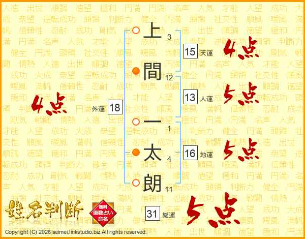 上(3画)間(12画) 一(1画)太(4画)朗(11画)