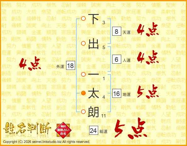 下(3画)出(5画) 一(1画)太(4画)朗(11画)