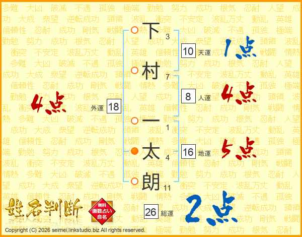 下(3画)村(7画) 一(1画)太(4画)朗(11画)