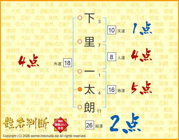 下(3画)里(7画) 一(1画)太(4画)朗(11画)