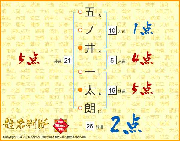 五(5画)ノ(1画)井(4画) 一(1画)太(4画)朗(11画)