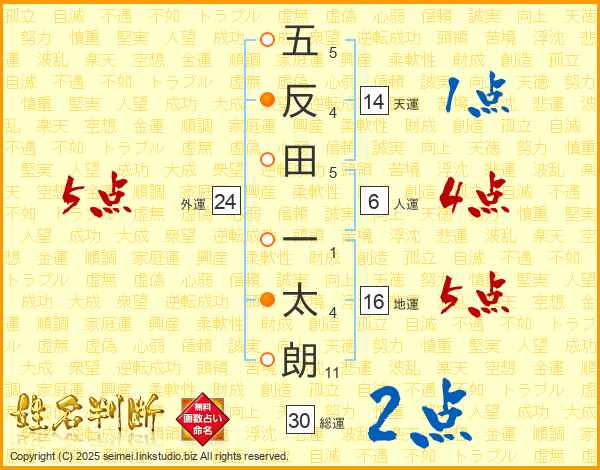 生活面を象徴する運勢です。外部から受ける影響力を表し、結婚運、家庭運や職場、環境への順応性を表します。総運から人運を引いた画数。姓や名が1文字の場合を除く。