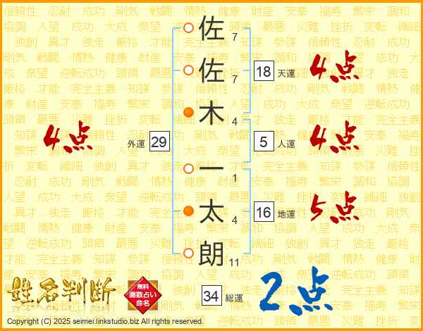 佐(7画)佐(7画)木(4画) 一(1画)太(4画)朗(11画)