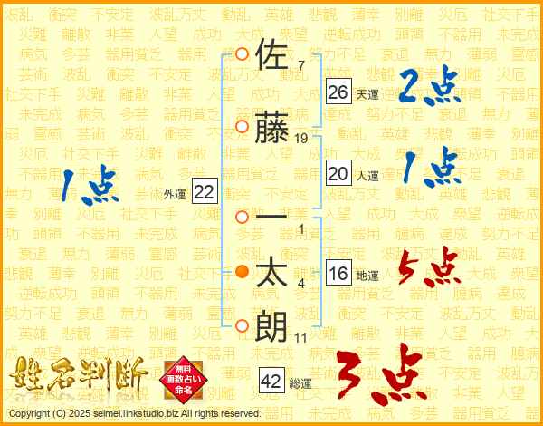 佐(7画)藤(19画) 一(1画)太(4画)朗(11画)