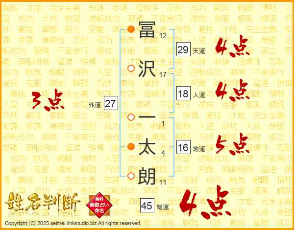 冨(12画)沢(17画) 一(1画)太(4画)朗(11画)