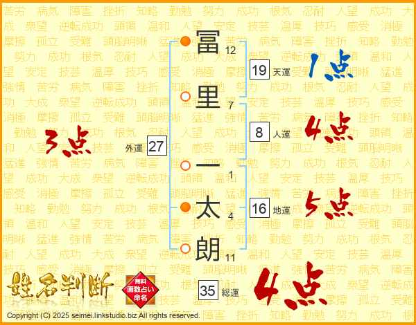 冨(12画)里(7画) 一(1画)太(4画)朗(11画)