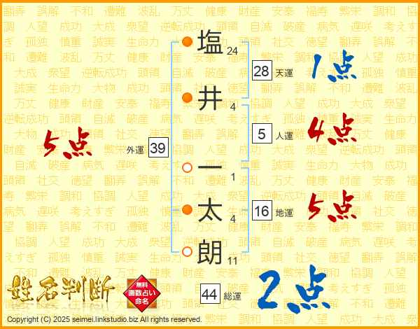 塩(24画)井(4画) 一(1画)太(4画)朗(11画)