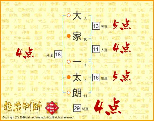大(3画)家(10画) 一(1画)太(4画)朗(11画)
