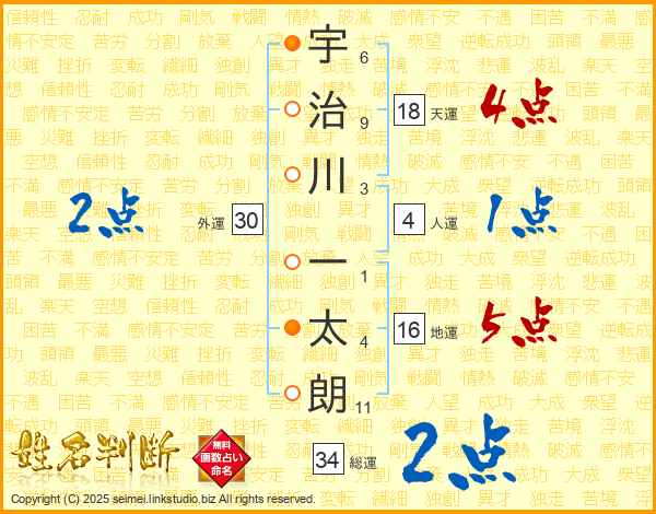 宇(6画)治(9画)川(3画) 一(1画)太(4画)朗(11画)