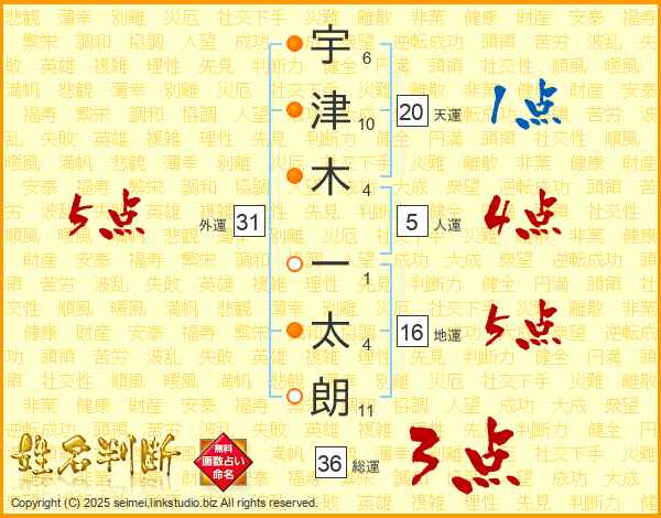 宇(6画)津(10画)木(4画) 一(1画)太(4画)朗(11画)