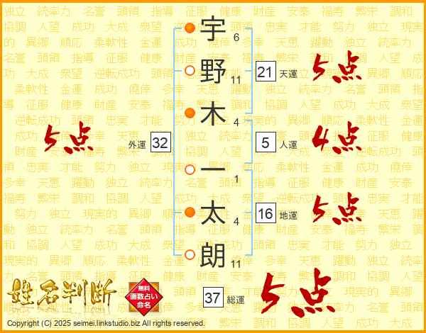 宇(6画)野(11画)木(4画) 一(1画)太(4画)朗(11画)