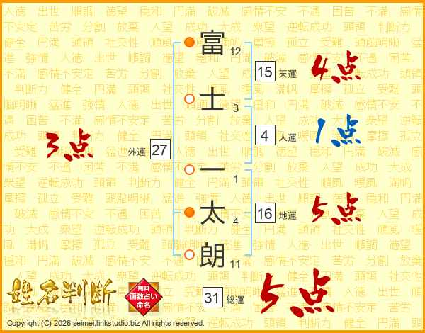 富(12画)士(3画) 一(1画)太(4画)朗(11画)