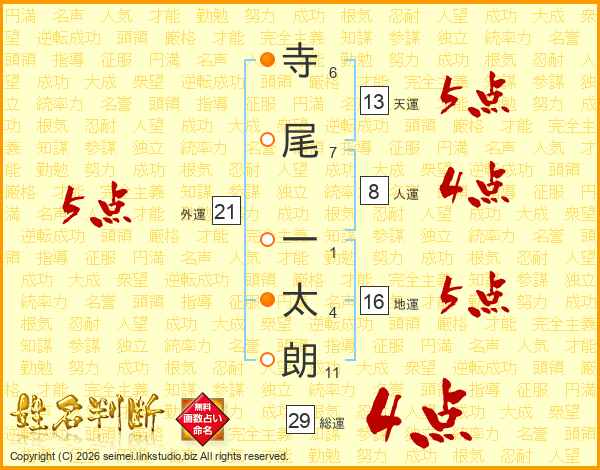 寺(6画)尾(7画) 一(1画)太(4画)朗(11画)