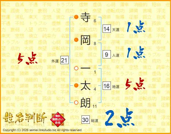 寺(6画)岡(8画) 一(1画)太(4画)朗(11画)