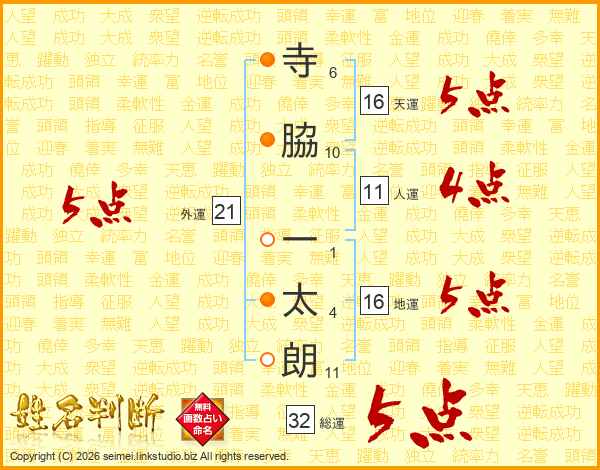 寺(6画)脇(10画) 一(1画)太(4画)朗(11画)