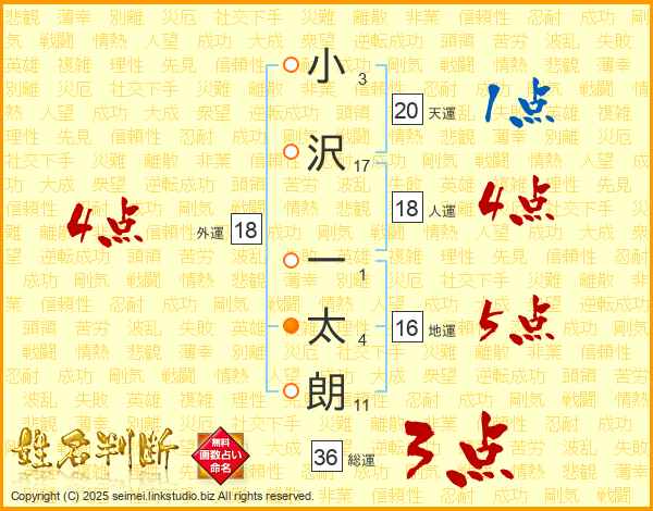 小(3画)沢(17画) 一(1画)太(4画)朗(11画)