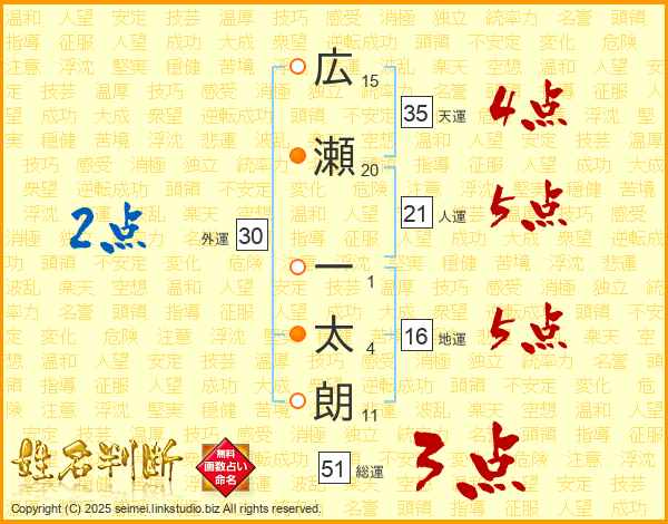 広(15画)瀬(20画) 一(1画)太(4画)朗(11画)