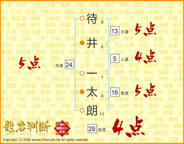 待(9画)井(4画) 一(1画)太(4画)朗(11画)