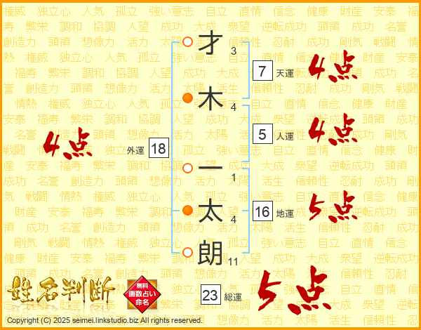 才(3画)木(4画) 一(1画)太(4画)朗(11画)