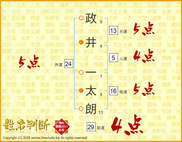 政(9画)井(4画) 一(1画)太(4画)朗(11画)
