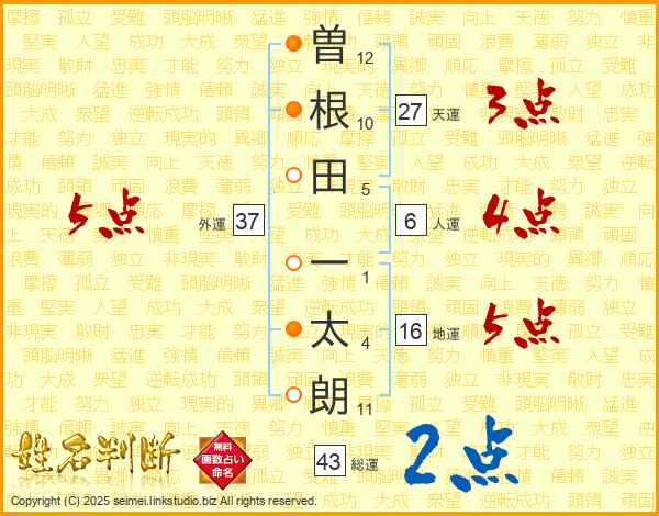 曽(12画)根(10画)田(5画) 一(1画)太(4画)朗(11画)
