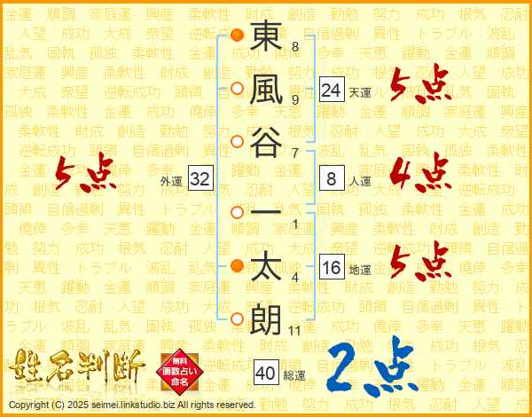 東風谷一太朗さんの総運は40画の2点!