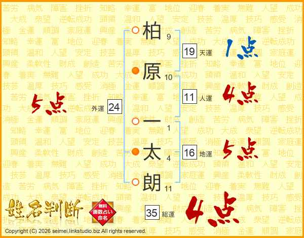 柏(9画)原(10画) 一(1画)太(4画)朗(11画)