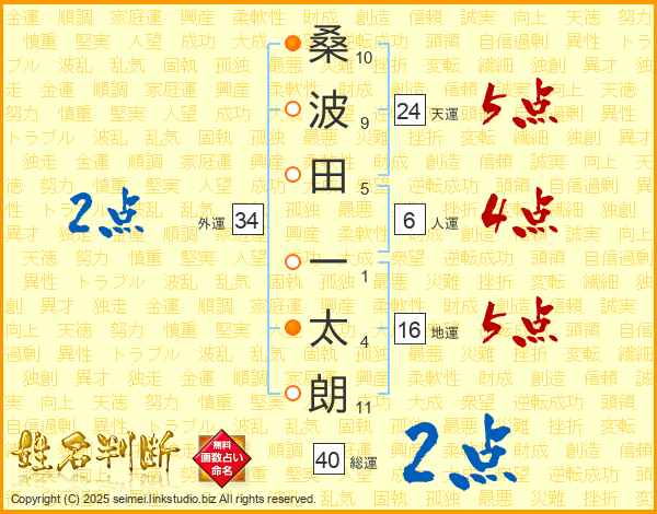 桑(10画)波(9画)田(5画) 一(1画)太(4画)朗(11画)