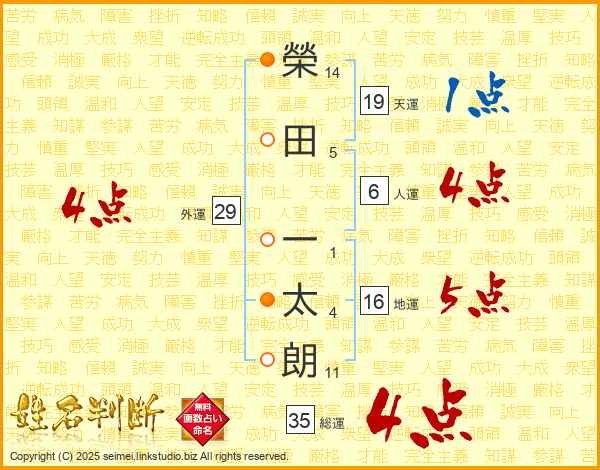 榮(14画)田(5画) 一(1画)太(4画)朗(11画)