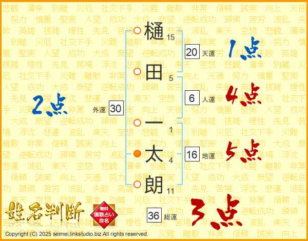 樋(15画)田(5画) 一(1画)太(4画)朗(11画)