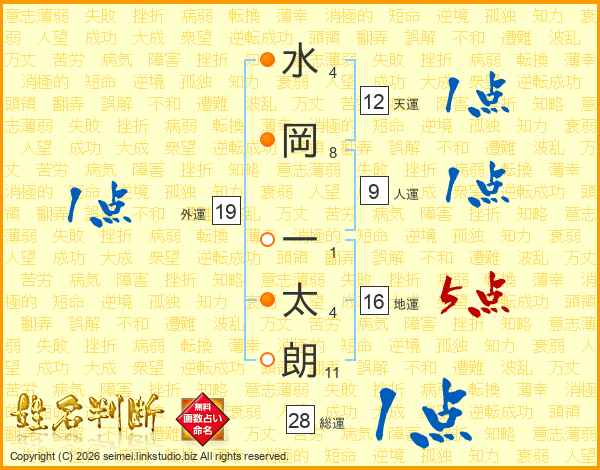 水(4画)岡(8画) 一(1画)太(4画)朗(11画)