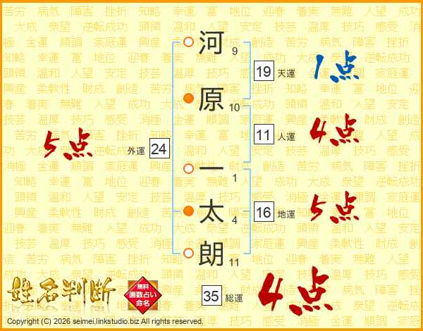 河(9画)原(10画) 一(1画)太(4画)朗(11画)