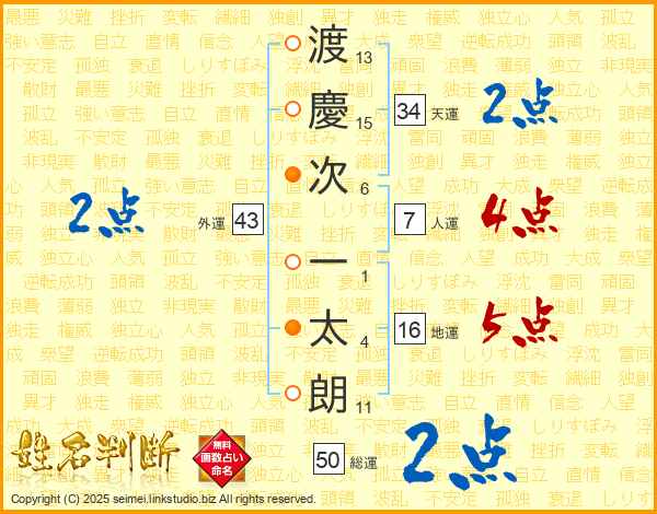 渡(13画)慶(15画)次(6画) 一(1画)太(4画)朗(11画)