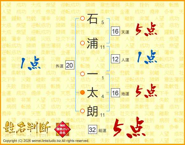 石(5画)浦(11画) 一(1画)太(4画)朗(11画)